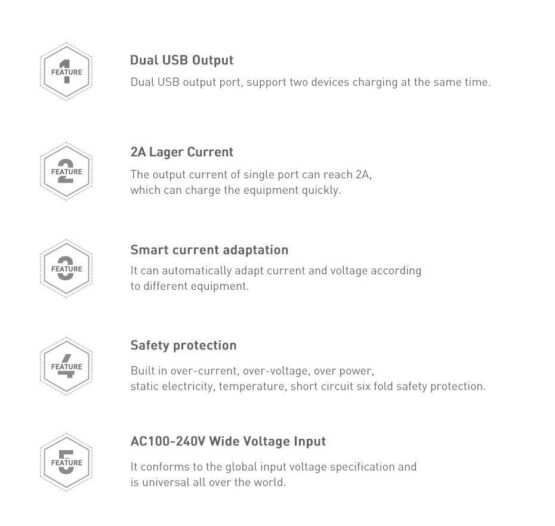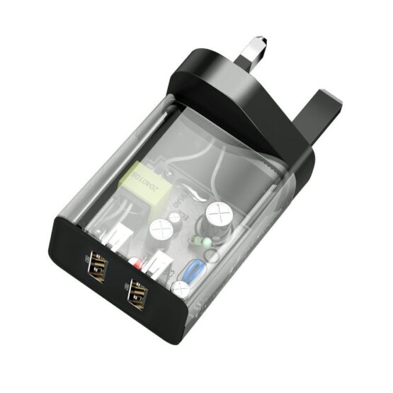 - Baseus proposes a plug with two USB ports. In total, they have a maximum current of up to 2.1A. Even though it works so efficiently, there is no risk of burns. The device does not overheat, and the maximum power with which it works is automatically adjusted. Thanks to this, the housing remains cool in all circumstances.