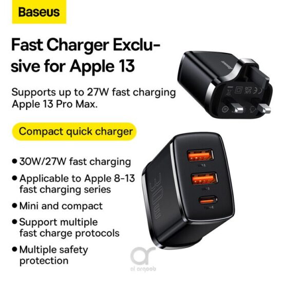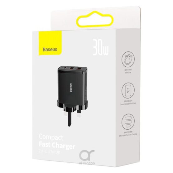 Baseus, Compact Fast Charger, 2 x USB-A Ports & 1 x Type-C Port, PD 30W – Black